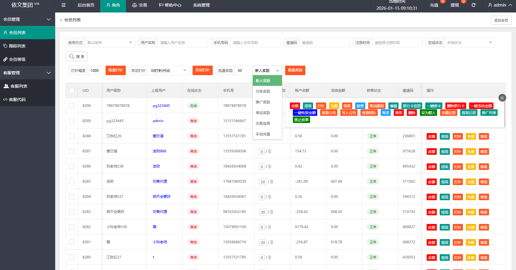 批量打针,批量奖励,信誉分,会员跟踪,一键冻结,一键绑卡等功能