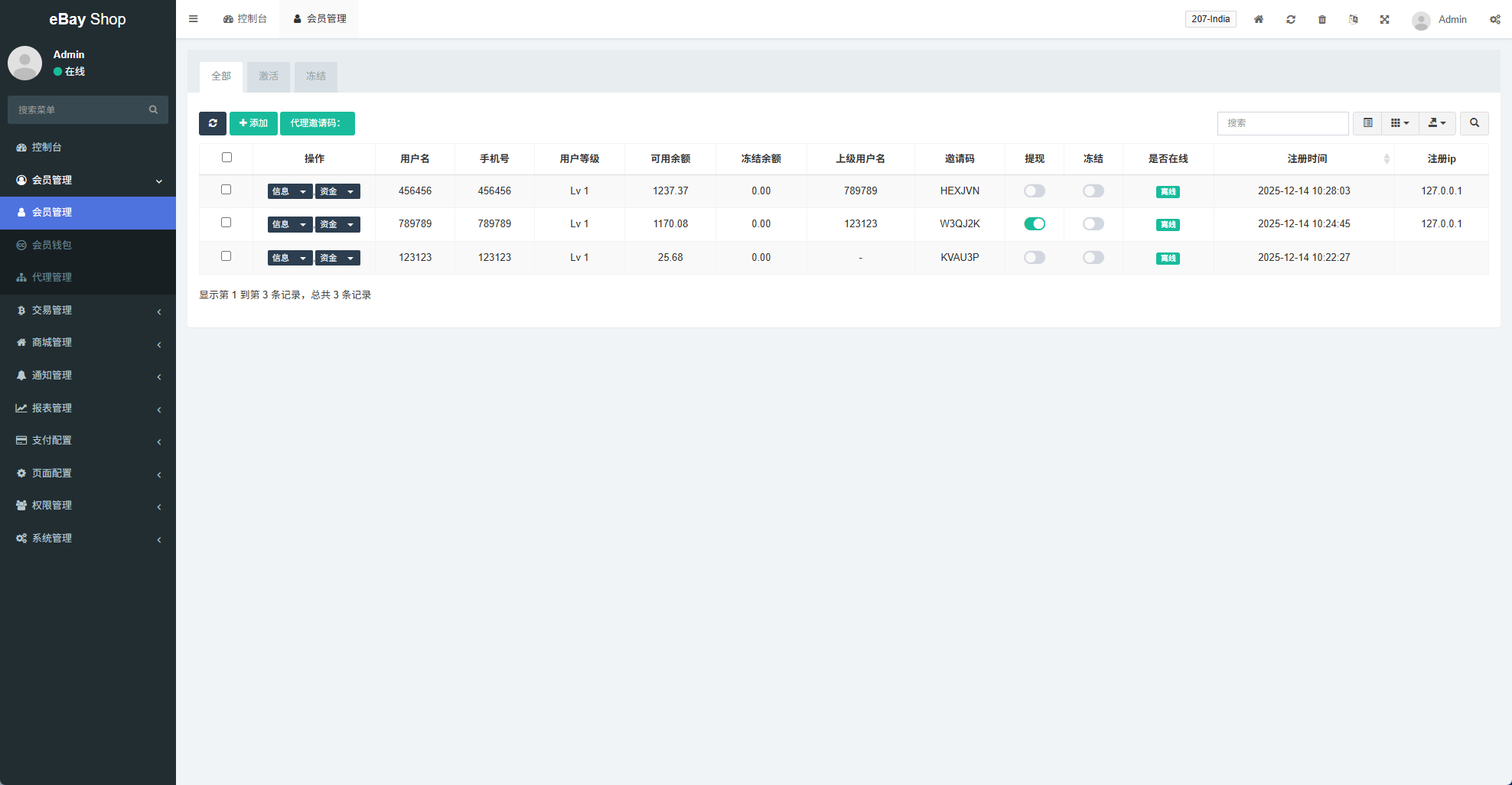 支持单独设置某用户禁止提现,或冻结;